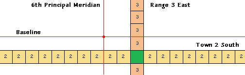 The example below illustrates the location of Town 2 South, Range 3 East of the 6th Principal Meridian, which correlates approximately with Washington Township of Washington County, KS.
