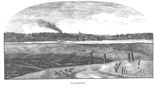 [PLATTSMOUTH.] Plattsmouth, the county seat of Cass County, is located on the west bank of the Missouri, a few miles below the mouth of the Platte River, twenty-one miles south of Omaha and thirty miles north of Nebraska City, its situation being particularly favorable to its material growth and permanent prosperity. It rests, like Rome, upon its seven hills, but, unlike its ancient prototype, no pestilential marshes lie within its borders, the entire city being at all times above high water, and secured from the ill effects of stagnant pools and streams by the natural drainage which its slopes afford. A narrative of the early settlement of Plattsmouth will be found in part in the history of the county, the first settler being, as has been said, Samuel Martin, who, under a special permit from the Secretary of War, crossed the Missouri early in the spring of 1853 for the purpose of establishing a trading post below the mouth of the Platte River. Martin brought with him from Iowa, on the ice of the Missouri, the logs of a house which he had erected in that State, using the material in the construction of a substantial two-story building on the north side of Main street, on Lots 6 and 7, Block 31, of the present town site. In this work he was assisted by James O'Neil, Col. J. L. Sharp, and possibly others. In the fall of the same year, a second house was erected, a short distance from the first, by James O'Neil, working in Martin's employ. The Plattsmouth Town Company was organized October 26, 1854, by Samuel Martin, James O'Neil, C. Nuckolls, J. L. Sharp, Manly Green and Lafayette Nuckolls. In November, 1854, the city was laid out and platted by O. N. Tyson, the surveyor of the company, and on March 14, 1855, a special act of the Legislature was approved, defining the boundaries of Cass County and establishing the seat of justice, duly incorporating the city of Plattsmouth. At this time, the formidable rival of Plattsmouth was Kenosha, situated about twelve miles farther south. upon the Missouri River, and considerable feeling existed as to which of the two towns would secure the county seat, the disadvantage under which the former labored being its location in the extreme northeastern corner of the county. It is related in this connection that a self-constituted committee of Plattsmouth citizens, going to Omaha as lobbyists, had a map of Cass County, prepared by one Henry Coulson, showing the mouth of the Platte to be nearly ten miles farther north than it actually was, as respects its vicinity to Plattsmouth. This map, being laid before the committee having the matter in charge, was regarded as answering conclusively the only argument on the question, and Plattsmouth was accordingly made the county seat. About this time, a ferry was established across the Missouri, under a charter granted to Wheatley Mickelwait, James O'Neil, J. L. Sharp, J. G. Palmer, Lafayette Nuckolls and their associates, this being one of the seventy acts of incorporation of the first Territorial Legislature, being approved March 1, 1855. Until 1857, a flat-boat was run, followed by the Emma, and by the Survivor in 1859, the latter sinking while in passage in 1860. Then came the Paul Wilcox, that struck a snag and went down; then the Mary McGee, cut to pieces by the ice on April 8, 1877; then a wire cable ferry, succeeded by the Luella; and finally the Belle Morgan, still in active use. The Survivor was first put on early in 1859, by Peter A. Sarpy, and run in opposition to the Emma for about a year, before a compromise was effected by which it succeeded the former boat. The contest was a warm one, both ferries carrying passengers and teams free of charge for a good portion of the time, and frequently offering a bonus for patronage, it being related of Sarpy that, upon one occasion, he offered to take one wagon of a train over the river for nothing, or, as he told the leader, if they would all go by his boat, he would give them a dollar and a gallon of whisky. Peter A. Sarpy, so closely identified with the early history of the State, and of Sarpy County, was a man of whom many incidents are related indicative of strong character. A brusque and fearless trader with the Indians, over whom he had the control of a king; a leader of civilization, who yet left it behind him to a great extent when he turned his back to the rising sun; a man stern and unyielding in the discipline which he exercised over his French and half-breed employes, and yet, withal, a polished, suave, punctilious French gentleman. The story of his direct connection with the history of Cass County can be told in a few words. At the time he placed the Survivor upon the river, he was living at St. Mary's, Iowa. He removed from that point to Plattsmouth in 1861, engaging in the mercantile business with Henry Kahl, and removing from St. Mary's to Plattsmouth a steam flouring-mill, which he continued to run for several years, when it was sold to Campbell & Wethely, subsequently changing hands several times, until it was removed to Kearney, Neb. For many years, he had been suffering with an incurable disease, and, during the fall of 1864, continued to grow weaker and weaker, until, in January, 1865, in the early morning following a cold winter night, during which he had several times gotten up from the bed on which he lay, and, putting on coat and hat, gone out into the bitter air--he died. He had said, an hour before, "I shall not last much longer," and, as the faintness of death began to come upon him, asked help of his faithful nurse, who alone was with him, in moving from the bed to the sofa in the room, breathing his last before it was reached. He was buried in the old cemetery west of the high school building and subsequently his remains were removed by his relatives to St. Louis, where they now rest. Plattsmouth was made a post office in the fall of 1855, Wheatley Mickelwait being the first Postmaster. It is said that for a time all the mail matter re