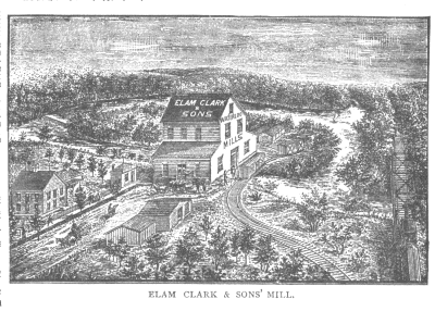 The town of Waterloo was laid out in 1871, upon the lands of J. H. Logan and G. A. Kelsey. At the same time the Union Pacific Railroad Company was given a half interest in the town, in return for facilities, and erected a neat depot twenty-four by forty feet. Although the town was laid out as late as 1871, there had been a settlement for a number of years previous, homesteads having been taken by J. H. Logan, William Short and others as early as 1862. A post office was established in 1864, with J. H. Logan as Postmaster, and the business of the office was transacted in his house as late as 1870. In this year, E. A. Kelsey received the appointment, which he held until 1875, when M. W. Purchase, the present incumbent, received his commission. Kelsey followed Logan's example, and used his house as a post office, but with the change of 1875, the mails were given special quarters in the store of Purchase & Barber, where they are still handled. The first school in Waterloo was taught in the summer of 1865, by Miss H. H. Thomas, who had an audience of six scholars, and kept school in the sod house of a homesteader. In 1871, the present schoolhouse was erected at a cost of $2,000. To meet the outlay necessary for this building, bonds to the amount of $1,800 were issued, the necessary money above that amount being raised by subscription. These bonds, which had eight years to run, and bore ten per cent interest, were taken up at maturity. In the summer of 1881, a new schoolhouse, for the use of the primary department, was begun, and is now (April, 1882) nearly completed. The cost of the new structure will be about $1,100. To meet this, bonds to the amount of $1,300, running five years, and bearing seven per cent interest, have been issued. The report of 1881 shows an enrollment of fifty-one males and fifty-six females, a total of 107. There are two departments under the charge of Mr. G. G. Burton and Mrs. E. J. Burton. A third will be established in 1882. The first store in Waterloo proper, was opened in 1869, by W. A Denton, and has been the scene of many business changes, Donahue Bros., J. C. Weston, R. R. Watts, L. B. Williams & Co., and Purchase & Barber, having successively occupied it. It is now operated by the last named firm. In 1879, J. G. Herrington started the second store of the town, and in March, 1882, Smith, Thompson & Co., commenced business. The first blacksmith was M. L. Weaver, who began work in 1869. The first drug store was started in 1876, by C. H. Clark; the first carpenter shop by John M Hopper, in 1880. The first physician of the town was J. W. Agee, who came to the town in 1864, and still remains in practice. He was followed in 1875, by J. McLaughlin; in 1876 by C. H. Clark; in 1878, by A. B. Elwood; and in 1879, by R. H. Huddleston. Of these, all but Clark and Elwood, are still residents of Waterloo. [ELAM CLARK & SONS' MILL.] The Waterloo Mill.--In 1872 Elam Clark and sons built a dam across the Elkhorn at the point where the Waterloo Mill now stands. No complete plan was carried out, however, and the mill was run on a small scale until the last part of 1875. Early in 1876, the building, in its present form was completed and new water wheels of an improved form were put in use. The structure is forty by sixty feet and has three and one half stories and a basement. The water wheels are five in number; one forty-eight inches, one forty-two inches and three thirty-six inches each in diameter. They are of the American form, and are rated at 100-horse power. The capacity of this mill is estimated at 100 barrels of flour and 200 barrels of meal or feed. The first cost of the building and machinery was $20,000 but recent improvements swell the total to $30,000. During 1881 the sales of the mill footed up to $90,000. A side-track leading directly to the door of the mill is now being built by the Union Pacific Railway and will greatly facilitate the increased business, which will naturally come from the larger crops consequent upon multiplying acreage under cultivation. The Waterloo Immigration and Improvement Association, having for its object the growth of the town, was organized on February 17, 1880. The following day nineteen persons signed the constitution as charter members and the following officers were elected: Dr. R. H. Huddleston, president; J. R. Watts, vice-president; W. H. Clark, secretary; J. G. Harrington, treasurer. A board of directors consisting of E. Messenger, E. S. Stout, J. H. Logan, J. B. Silvas and F. G. Clark was chosen. The officers for 1882 are the same as those first elected, but there have been slight changes in the board of directors, which is as follows: E. Messenger, president; L. W. Denton, vice-president; J. H. Logan, secretary; George Johnson, treasurer. The Waterloo Loan and Building Association is an important organization incorporated under the State Laws of Nebraska, in September, 1881, with an authorized capital of $100,000. The prime object of the society is to encourage building in the town by advancing funds to those desirous of obtaining homes of their own. Its officers are: W. H. Clark, president; J. McLaughlin, treasurer; G. A. Bryant, secretary. The association has, during the five months which it has been in operation, sold four loans of $200 each, and has been the means of erecting several buildings, among which are George Campbell's residence, corner of Second street and Washington avenue, S. A. Kopp's residence on Lincoln avenue and C. A. Colvin's residence on Madison street. The association is gaining strength and will aid many of our mechanics and laboring men to secure homes by their savings in this association. Lodge No.-- A., F. & A. M., was organized under a dispensation, in March, 1882. Fifteen members signed the charter roll and the following officers were elected: I. A. Arnold. W. M.; Charles H. Harrier, S. D., W. H. Clark, J. D., Meetings are held each month, on or before the full moon, in the second story of the newl