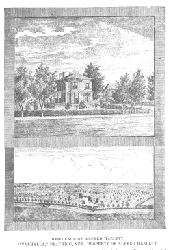 GESSELL ~ PADDOCK JOHN GESSELL, meat-market, was born in Fairfield County, Ohio, in 1828, remaining there until twenty-two years of age. In 1850, he went to Indiana and located in Delaware County, where he was engaged in shoe-making for nineteen years; he then started West and located in Gage County, Neb., nine miles northwest of Beatrice, on a homestead on Section 34, Township 5, Range 5, remaining there twelve years, when he sold out and bought a farm two miles south of Beatrice, selling in the winter of 1881, and located in Beatrice going into a meat-market with his son-in-law in February, 1882. Was married in 1850, in Fairfield County, Ohio, to Miss Sarah Brook. Miss Brook was born in the same county in 1832. They have twelve children, five living, viz: Maggie, Jessie, Elmer, Lemuel and Oscar. Enlisted in 1864, in Delevan County, Ind., in the Twenty second Indiana Infantry, serving until the close of the war--about seven months. H. W. GIDDINGS, farmer and manager of the Kansas & Nebraska Stage Company's farm, one mile east of Beatrice, was born in Erie County, Penn., in 1830. In 1842, he went to Warren County, Ill., where, after a time, he engaged in farming, and afterward in running one of the largest dairies and creameries in that section; in this connection he kept buying land until, in 1870, he had 900 acres. In 1873, his creamery was burned, causing his financial ruin. In 1874, he moved to this State, settling in Buffalo County, a short distance from Shelton, where he engaged in farming, but, meeting with reverses, he came to Gage County as manager of the Stage Company's farm, and now owns 240 acres of land in Section 36, Town 4, Range 6, together with considerable stock, and owes no man a dollar. Mr. G. was married in Erie County, Penn., on September 14, 1854, to Miss Rebecca McClure, and has nine children, namely, Flora, Carrie, Jennie M., Stutely I., Edwin M., Harry, Carl, Ralph and Susan. L. T. GRIGGS, dealer in farm machinery, was born in Indianapolis, Ind., in 1843; soon after his parents emigrated to Clinton County, Ind., remaining there the most of the times until 1862, when he enlisted in the Eleventh Indiana Cavalry, as private, Company A, and was discharged in 1865, with a Lieutenant's commission. In 1865, he settled in Pawnee County, Neb., taking a homestead in Section 31, Town 5, Range 5, remaining four years on his place, when he located in Beatrice, and was engaged in farming; then went into the law office with his brother, remaining three years. In 1875, he commenced handling farm machinery, which he is now engaged in. Was married in 1869, in Gage County, to Miss Carrie E. Gale. They have five children--Mollie, George, Clifton, Kirk and Burt. Was City Marshal in 1876. Is a member of the Rollins Post, G. A. R., of Beatrice, and is a member of Beatrice Lodge, No. 26, A., F. & A. M., Chapter No. 7, and of the Commandery, No. 7. Is a member of the I. O. O. F., and of K. of H., No. 4, and I. O. G. T. [RESIDENCE OF ALFRED HAZLETT.] ["VALHALLA," BEATRICE, NEB., PROPERTY OF ALFRED HAZLETT.] ALFRED HAZLETT was born in Indiana County, Penn., the 9th day of June, 1848, and is of the Scotch-Irish descent. He was educated at Washington and Jefferson College, Cannonsburg, Penn., and read law at Greensburg, Penn., with Senator Cowan, and was admitted to the bar in June, 1871. He came to Beatrice in October, 1871, where he has remained engaged in the practice of law. He has served as County and City Attorney, and was County Judge for two successive terms. For the last five years, he has been the law partner of Col. L. W. Colby, and has now one of the most lucrative and extensive practices in Southern Nebraska. He has no political aspirations, belongs to no secret order, is liberal on all questions, and foremost in all public enterprises tending to build up and improve his town and county. He has provided for himself one of the best homes in his part of the State, located in the city of Beatrice, and has a fine stock farm, highly improved, adjoining his home, and commanding the finest view at Beatrice, and the surrounding country. He was married in Omaha in July, 1875, to Libbie Cotton, formerly of McLean County, Ill. C. N. HAMMOND, druggist, is a native of Knox County, Ill. He was born near Oneida, June 26, 1857. When about seven years old, he moved to Galva, Henry County, and lived there until 1872; he then removed to Cambridge, staying there a year, and then to Elmwood, where he lived one year; after that, he returned to Galva and carried on a drug business for Eck, for about three and one-half years. He traveled for the safe manufactory of John W. Norris; then traveled for Samuel I. Smith & Co., for a year, after which he spent eleven months at Maryville, Mo., in the drug business. He was married at Cambridge, Ill., to Geneva C. Wier, a native of Illinois, December 21, 1880. He is a member of the N. W. Traveling Men's Association. HON. ROBERT B. HARRINGTON, came to Nebraska in November, 1872, and located at Beatrice, where he has since been farming. He was Receiver of the U. S. Land Office, Beatrice, for five years, from October, 1875, to January, 1881. He was a member of the Constitutional Convention in 1875, and has been Mayor of Beatrice. He was President of the Gage County Agricultural Society. He was elected a member of the State Senate in 1880. He was born at Cincinnati, Ohio, October 11, 1829, and lived there until he was nineteen years of age; then settled at Plainsfield, Will Co., Ill., where he remained eight years. From there he went to Livingston County, Ill., and lived there until he came to Nebraska. He was County Clerk of Livingston County for eight years. He was married at Plainfield, Ill., December 3, 1850, to Miss Nancy P. Cropsey; she died October 17, 1867, leaving three children--Algernon S., Anthony H. and Mary E. He was married to his present wife at Ottawa, Ill., September 1, 1868. She was Mrs. Harriet M. Whitmore, a native of New York. They have had th