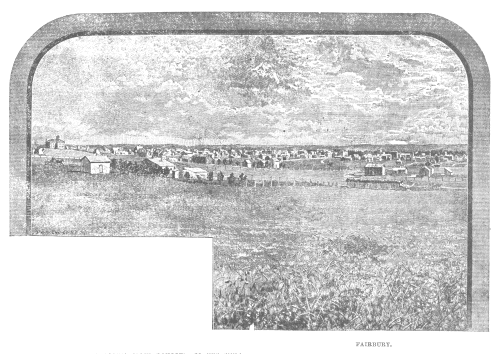 Calamities Part 2: Indian Troubles | Wild Bill | Ives Marks | Russians Officers Part 3: County Buildings | Railroads | Agricultural Society Schools | Taxable Property | Population Fairbury: Fires and Storms | City Roster Schools | Churches Part 4: Fairbury (cont.): Societies | The Press | Newspapers Banks | Manufactories | Progress | Meteorological Biographical Sketches Part 5: Steele City: Schools | Churches | Societies | Newspapers Business Interests | Biographical Sketches Part 6: Other Towns: Endicott: Biographical Sketches Reynolds | Diller: Biographical Sketches | Others Illustration: [View of Fairbury.] JEFFERSON County was first set apart by the Territorial Legislature January 26, 1856, under the name of Jones County. Thayer, the adjoining county on the west, was designated as Jefferson at the same time. In 1864 Jefferson County organized by holding its first election at Big Sandy. February 18, 1867, an "act to enlarge Jefferson County" passed the Legislature, which untied Jones County to Jefferson. This gave the county 706,560 acres, which was deemed too large by the Legislature of 1870-1, and in 1871 an act passed providing for the division of Jefferson, which was effected in the fall by the election of two sets of officers, the Sixth Principal Meridian being the dividing line. The former Jones by the separation became Jefferson and the former Jefferson assumed the name of Thayer. Jefferson borders on the State of Kansas, and is the fourth county west of the Missouri. On the north it is bounded by Saline and on the east by Gage County, south by Kansas and west by Thayer County, containing 576 square miles or 368,640 acres of land, at an average elevation above the level of the sea of 1,200 feet. From 1857 to 1864 Jefferson was attached to Gage County for judicial purposes, during which time there was several important criminal cases of this county tried in Gage. The Otoe Indian Reservation cut off twenty-four square mile from the southeast corner of the county, but was about the first land of that Reservation sold to actual settlers. The greater portion of it has been sold. STREAMS, SOIL, AND NATURAL PRODUCTS. The principal stream of the county is the Little Blue river, running diagonally through the county form northwest to southeast. It is a beautiful stream, and yet more useful than beautiful, furnishing most abundant water power the year round. The current is rapid, but with a gravelly bottom the water is always clear. Like most of the streams of Nebraska south of the Platte River it receives its supply principally from that never-failing stream. It is about forty feet below the surface of the uplands to a gravel bed through with the water flows from the Platte, and consequently the banks and bottom of the Little Blue is lined with springs. About two miles from Fairbury there is one spring that furnishes a sufficient flow of water to run one moderate sized stone-buhr. Big and Little Sandy Creeks water the northwest portion of the county, and afford many good mill privileges. Their tributaries to the east supplied by springs makes that portion well adapted to stock raising. Rose Creek, a beautiful stream with numerous branches, flows in an easterly direction along the line that divides the first and second tier of townships, and empties into the Little Blue. It affords good water power that has been quite thoroughly employed from the earliest settlement. The first mill in the county was upon this stream. Cut Creek waters the northeast portion, which is not as abundant in running streams as the rest of the county. Rock Creek waters the southeastern portion of the county. Jefferson has a fair share of the timber of the State, being favored with more than the counties to the west and with less than those toward the Missouri. The banks of the Little Blue are quite well timbered. Elm and cottonwood are most abundant, but oak, walnut and maple abound in certain localities. Most of the creeks have a fine growth of young timber, but if it were not for the care taken in timber cultivation the present supply would soon be exhausted. The county reports, for an equal area, the largest number of trees under cultivation. Nearly every farmer has a large grove of select varieties, including rapid and slow growth woods, and aggregating about 4,000,000 trees, besides many miles of honey locust and osage orange hedging. Small fruits do well and are becoming to be very extensively cultivated, and although the apple, pear, peach, and kindred fruits have as yet not had time to be thoroughly tested, the result thus far is very satisfactory. There are reported under cultivation 15,240 apple trees, 944 pear, 19,656 peach, 2,406 plum, 4,624 cherry, and 75 acres of grapevines. In the Russian settlement there is an abundance of mulberries, the plant, however, is cultivated principally for the silk worm. In various parts of the county are quarries of excellent limestone, from which a superior quality of lime is made. There are a number of red sandstone, but very little of it is sufficiently hard for building purposes, and that which is hard, is generally scaly or in thin layers. There are extensive deposits of potters' and brick clay of superior quality. The former is being used, and the latter is the principal mortar material used in building. The surface of Jefferson County is very rolling along the streams, which becomes gently undulating as it recedes. There is very little, however, too hilly and broken for agricultural purposes. The disposition of hills and vales in many parts of the county produces beautiful landscape views. As you approach the streams there are numerous draws, but are generally very narrow. The soil is generally very fertile and exceedingly so in the bottoms, and well adapted to the cereals. The valley of the Little Blue, varying in width from a half to two and a half miles, is exceedingly fertile, and the encircling hills affording excellent grazing ground are very picturesque i