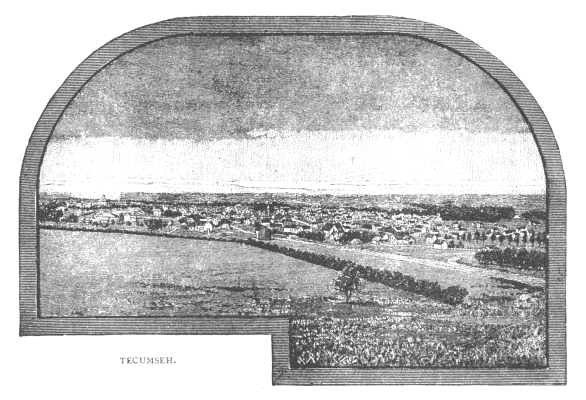 [TECUMSEH.] The site of the town of Tecumseh has been a point of settlement from the earliest history of the county. Some of the first comers of this region put up their log cabins on this spot. Situated on the old Brownville and Marysville trail, much travel passed through the point, and the nucleus once formed, the development of a town was a matter of course. Old John Maulding--once a prominent citizen, and a pioneer of Johnson County, but now a beneficiary of the town's charity through the vicissitudes of fortune--laid out the town site of Tecumseh in the summer of 1856. The name first given to the town was "Frances," in honor of the wife of Gen. Johnson, for whom the county had been named. The following year, however, the name of Tecumseh was fastened upon the embryo town, history having linked the name of the noted redskin warrior in indissoluble association with that of the General referred to above. The first settlement here was of the crudest character, half a dozen log structures of the most unpretentious character, comprising all there was of it. Of these original "land marks," but one remains, that being now a portion of the Sherman House, a leading hotel of the place. John Maulding kept store here for the benefit of the handful of inhabitants, and also of the traveling public, who were numerous. Tecumseh became gradually a favorite stopping place for voyagers, to or from Brownville, and within a year after its location, had easily surpassed all aspiring rivals in the county, of which there were not a few. On the 13th of February, the county seat was located here by an act of the Legislature of that date, and a slight impetus was immediately given to its rising fortunes by the prestige thus acquired. This fact gave rise to a profound feeling of jealousy on the part of other settlements in the county, culminating, as is stated elsewhere, in the calling of an election August 2, 1858, for the purpose of settling the dispute. The result of this election perpetuated Tecumseh's title as shire town, and marked it out in advance, as the leading point in the county for all time. William P. Walker was commissioned Postmaster at Tecumseh in May, 1857. Previous to that time, those of the inhabitants who had correspondence with the outside world, either went to Brownville for it or awaited the semi-occasional visits of the overland mail carrier. Mail facilities through this county were very crude for a number of years. It was, in fact, late in the sixties before anything like a perfect system was brought into effective service. Late in 1856, a wooden bridge was thrown across the Nemaha, at this point, which was replaced by a more substantial and elaborate structure in 1866, the city of Brownville contributing $800 for the purpose. The trade of this point and that of many other diminutive settlements south and west of Tecumseh centered in Brownville, whose merchants at that time showed commendable energy in securing all the patronage possible, where enterprise could do it. In 1857, the first attempt was made to utilize the water power furnished by the Nemaha River, Messrs. Maulding & Moore putting up a saw-mill at Tecumseh. This ran at intervals until 1867, when Alexander and S.W. Bivens erected a grist mill on its site, the later still in operation by William H. Brandon. Hard times fell to the lot of the early settlers of Tecumseh for many years. The opening of the war found it a struggling hamlet of about 100 persons, away from all important lines of communication, harassed by the presence of refugees, horse-thieves and militia in turn. As the war progressed, considerable freighting was carried on through the town, between the river points and the military posts upon the frontier. At the close of the Rebellion, the town picked up quite rapidly, many soldiers coming out to the county to take up land or enter business. Among these acquisitions may be named F. A. Gue, John Wilson, W. G. Swan, Joseph Buffun, D. P. Henry, J. S. Dew, W. L. Dunlap, W. H. Doolittle, M. V. Easterday, C. A. Holmes and R. Bryson. The first church building--Catholic--was erected in Tecumseh in 1868. The iron bridge, which spans the Nemaha at this point was finished in 1869. In 1868, bonds were issued by the county for the erection of a court house at Tecumseh, and the present building was put up. The cost of this building, of which H. P. Bickford was builder, was $2,800. It is a square frame structure of two stories, with a cupola above and though not particularly ornate to-day, considered a grand improvement at the time of its completion. The first newspaper was also started in Tecumseh in 1868. The town of Tecumseh was incorporated on the 4th of February, 1867, Alexander Bivens, R. B. Presson, S. L. Ward, Seymour S. Rogers and Darius Cody being chosen Trustees. The approach of railroad connections first started Tecumseh into a rapid growth. The Atchison & Nebraska Railroad was surveyed through the town in 1871. This fact made business brisk, and brought in a rapid influx of strangers. In that year the town was organized under a city form of government, with C. R. Bryant, as Mayor. This was continued down to 1880, when, owing to action of the Legislature, in limiting the population of cities of the second class, to places of 1,500 inhabitants and over, Tecumseh was obliged to take a back seat again, and renew the town government. This change was due to the criminal negligence of the census taker appointed to count noses, he being only able to discover 1,450 inhabitants. This lack of enterprise or ignorance of mathematical principles, whichever it was, deprived several ambitious citizens of the chance of filling the mayoralty for some years to come. April 25, 1872, the Atchison & Nebraska Railroad ran its first train of cars into Tecumseh, and the event was celebrated by a grand excursion to Atchison, 500 citizens availing themselves of the opportunity to travel. In the fall of 1875, a disastrous conflagration swept