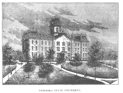 [NEBRASKA STATE UNIVERSITY.] The University of Nebraska is constituted by law a part of the educational system of the State. It owes its existence to the same authority that has given to the State its system of common schools, and its interests have been lodged in the hands of a Board of Regents, elected by the people. It was no doubt the intention of those accepting the various grants of land made by the United States, to make the University the crowning work of the educational system of the state--that it should sustain a close and vital relation to the high schools and common schools, and to all other institutions of learning, which may, by law, be established. With wise forecast, it aims to secure to all the members of the commonwealth, who may avail themselves of its generous provisions, an opportunity of a broad and liberal education. It is in its infancy, but already the departments of literature, science and art, are offering exceptional advantage for liberal culture, and it is the design to open in time technical and professional courses. A step has been taken in advance of the universities of Europe, by admitting into the same class room both sexes. This is an American movement, and has been successful wherever tried. Especially is it true in this pioneer State and University. With this liberal provision for the educational needs of its citizens, and extending a cordial hospitality to students from other States, the University has entered upon the work for which it was founded, and from the first has enjoyed continued and increasing prosperity. The fear entertained by many at the outset, that it would be a failure because the State was so young and sparsely settled, is dispelled by the brilliant success of the past decade. The State has grown most rapidly, and, contrary to well founded expectation, the University has advanced nearly at equal pace. It must be understood that the greater portion of the increase in population were those who were seeking to establish a home somewhere in the new State, and that they were not prepared to at once build homes or put their lands in cultivation, and send their children to a university; but instead their children had to aid in securing the new home, and in providing for the daily necessities. The attendance at the opening of the University was about seventy, when the population of Nebraska was 133,000. The attendance the past year was about 375, with a population of half a million, showing that the percentage has increased. It has not only increased in attendance, but in its facilities for instruction. It is therefore confidently and reasonably expected that with a quadrupled population thoroughly and comfortably established, and with an increased competency, the University will make more progress in the next ten years than it has in the past ten, besides the population is likely to increase more rapidly by immigration. The following address delivered on Charter Day, February 14, 1881, by Prof. Samuel Aughey, gives the early history of the University: "The Territorial Legislature of 1865 and 1866 prepared a State Constitution, which was submitted to the people June 2, 1866. It was preceded by a somewhat bitter discussion. Among the arguments urged for its adoption was the fact that the sooner it was accomplished the finer the lands that could be obtained for educational and internal improvement purposes. After the vote was taken the constitution was declared carried. One of the provisions of the enabling act was that lands for an agricultural college and university must be accepted within three years, and colleges opened within five years afterwards. The trust was accepted by the State, and it received from the general government the promised gift. It is questionable whether the lands for internal improvements were wisely expended. Fortunately, however, the lands for the endowment of the agricultural college and university remain comparatively intact, and a wise provision of law prevents them from being squandered. The leasing and sale of them is so regulated as ultimately to secure a princely endowment for these institutions. "The Legislature that met in January, 1869, passed an act on the 15th of February--twelve years ago--to establish a State university, vesting its government in a board of regents, to be appointed, in the first instance, by the governor, who was ex-officio chairman; the superintendent of public instruction and the chancellor of the university being also members of the board. Under the new constitution the government is vested, as is well known, in a board of six regents, whose terms of office last six years, two new ones being elected every two years by the people. Previous to this--June 14, 1867--in the act for locating the seat of government, the agricultural college and the State university were united. "By an act of February 15, 1869, the governor, secretary of state, and auditor were appointed to sell the unsold blocks in Lincoln owned by the State, and to locate and erect a university building. Of the sum realized in this way, $100,000 was appropriated for this purpose. On the following first of June the plans and specifications prepared by M. J. McBird, then of Logansport, Indiana, were accepted by the capital commissioners for the university building. These plans were submitted to the board of regents June 3, 1869, and accepted, subject to any modifications which they might suggest. The contract for building was given to D. J. Silvers & Son, of Logansport, Ind., on the same day. About the middle of July, the contractors commenced work, and the walls were so far completed by September 23, that the corner stone could be laid, which was done with Masonic ceremonies, under the management of the Grand Lodge of the State. The committee of citizens who had charge of the ceremonies raised a subscription among themselves and hired a band in Omaha for $375 and expenses. They traveled here all the way from Omaha in carr