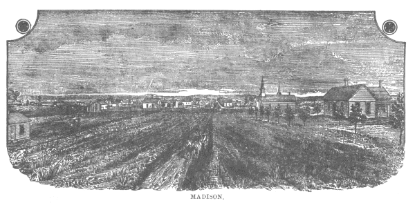 [MADISON.] This town was made the county seat October 12, 1875. It is beautifully situated at the junction of Union and Taylor Creeks. It is immediately surrounded by valley and rolling prairie, most of the land in all directions for a number of miles being well adapted to mixed farming. To the westward, in what is called the Knapp & Scheer settlement, are to be found farms equal, perhaps, to any in the State, both as regards their fertility and the improvements that have been made upon them. Good barns have been erected on most of the farms, which, on account of the scarcity of the timber, are seldom seen in Northeastern Nebraska, and, as a consequence many thousands of dollars have been lost to the farmers by the exposure to the weather, of their farm implements, vehicles and stock. The first settlement made in Madison was by H. M. Barnes and his sons, Frank W. and William J., the town site being located on the claim of Frank W. Barnes, who built the first log house in the fall of 1868. The first frame house in Madison was built by H. M. Barnes, in May, 1867, and the first store was started in May, 1872, by Michael Bauch. The post office was established in 1871, Sylvester Speed, Postmaster. The first marriage was that of Frank W. Barnes to Phebe Bauch, May 2, 1871; the first birth that of their son, Edward Y., February 19, 1872. The first marriage in Union Creek settlement was that of Leroy S. Rounds to Mary E. Flowers, early in 1869. The Presbyterian Church was organized in 1870. Rev. J. M. Wilson preached the first sermon during the same year, and their church was built in 1871. The Methodists were organized in 1870. Their first sermon was preached to them the same year, by Elder S. P. Vandoozer, and their church was built in 1875. The Catholics organized their church in 1880, and built their church edifice in 1881. The Lutherans organized in 1875, but have no building. The Madison County Sunday School Association was organized at Madison July 5, 1878. Madison was incorporated July 6, 1876. Her first Board of Trustees were F. W. Barnes, C. Neidig, T. M. Blakely, E. F. Prince and H. E. Becker. The village now contains five general stores, two hardware stores, two harness shops, two blacksmiths, two shoe shops, one furniture store, five agricultural implement dealers, one flouring-mill, two banks, three law firms, one doctor, two lumber yards, one brick yard, five stock-breeders, two hotels, two public and one private schools, one newspaper and about six hundred inhabitants. On March 31, 1882, the question of bonding the school district in which Madison is located, in the sum of $5,000, for the purpose of building a new schoolhouse, was submitted to the electors. One hundred and forty-nine votes were cast, thirty-one of them by women. Twenty-nine of these voted in favor of the bonds, which carried by eleven over the necessary two-thirds majority. The first newspaper published in the county was the Madison Review, established in 1874, by T. M. Blakely, who continued its publication until 1878. The Madison Chronicle was started in 1879, by Phillip Bauch, and is the only paper in Madison. It is one of the few country newspapers that have discarded the ready print feature, and is bright and newsy. W. J. BARNES, proprietor of Madison Hotel, is a native of Dutchess County, N. Y. In the spring of 1866, the family came to Columbus, Neb. The following year, they removed to Madison County, where he has since resided. The family are among the first settlers of the county. His brother pre-empted this land and laid out this town. His father pre-empted a quarter section on the north. W. J. also pre-empted a quarter section, making about one section which the family entered. He has since been engaged in farming, and has recently opened this house. F. W. BARNES, firm of Barnes & Tyrrel, bankers, is a native of Dutchess County, N. Y. In 1866, the family came to Columbus, Neb. May 3, 1867, they removed to Madison County, where he has since resided. Mr. Barnes entered 160 acres, on which the town of Madison is now situated. He laid out this town in 1870. In 1872, he engaged in banking, also in real estate, has since been engaged in this business. He has held the offices of County Surveyor, County Judge, Town Treasurer, Town Clerk and other offices. PHIL BAUCH, editor Madison Chronicle was born in Kankakee, Ill. Came, with his parents, to Madison in 1871. They engaged in merchandising, which they continued till 1878. This paper was established in 1877. H. E. BECKER, furniture and undertaking, is a native of Germany. In 1853, came to New York. Soon after, removed to Connecticut. There followed the carpenter trade. He enlisted, in 1861, in Company I, Tenth Regiment Connecticut Infantry; was discharged in 1864; returned to Connecticut; continued the carpenter trade. In 1874, came to Madison, Neb. Soon after, established this business. Mr. B. was one term County Commissioner. He is Chairman of the Board of Trustees; has been a member since 1876. He is also Secretary of the Madison Town Hall and Court House Association. Was also School Director for one term. DR. S. J. BRIDENSTINE, physician and surgeon, is a native of Pennsylvania. When a child, came to Johnson County, Iowa, with his parents. He attended the State University about six years; graduated from the medical department in 1875. He then came to Madison, where he has since actively engaged in his profession. He is one of the Commissioners of Insanity for Madison County. He is also surgeon for the Omaha, Niobrara & Black Hills Railroad. P. A. CLARK, coal and farm machinery, was born in Otsego County, N. Y. Came to Decatur, Ill. In 1861, attended the State Normal School of Bloomington; also engaged in teaching. Graduated from that institution in 1866. He continued teaching till 1868, when he came to Fremont, Neb. Was engaged in insurance and implement business about two years. In the spring of 1870, returned to Bureau County. Taught school there about tw