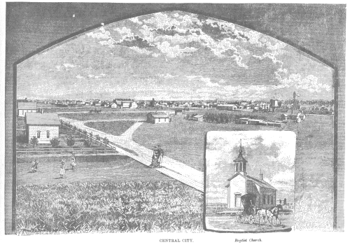 MERRICK County is situated in the valley of the Platte, bounded by Nance County on the north, the Platte River separating Polk and Hamilton Counties, on the east and south, and Hall and Howard Counties on the west. As now organized, Merrick County stretches thirty-six miles east and west, and northward along the west end of the reservation twenty-seven miles. It contains a total area of 468 square miles, or 299,498 acres. Situated as it is, nearly seventeen hundred feet above the level of the sea, Merrick County, like all of Central Nebraska, is favored with a fine, healthful climate. Few days during the winter months are extremely cold, and, during the summer months, the constant prairie breezes reduce the temperature during the day, and make the nights cool and pleasant. Occasionally, hot winds from the southwest prevail, and twice within the history of the county great loss has resulted from extended droughts; but, as a rule, the climate is healthy, invigorating and favorable to vegetation. The absence of all swamp lands makes this locality particularly favorable to the cure of fever and ague, and all malarial diseases. As remarked above, the Platte River forms the eastern and southern boundary of the county, and takes a north-easterly course for forty-five miles. This, with the Loup River, which touches the northern boundary line, forms a perfect system of drainage for all the country. Wood River, a branch of the Platte, penetrates the central portions of the county, furnishing drainage and a good water supply for these districts. It empties into the Platte, just south of the village of Chapman. An unfailing supply of water can be obtained all the way from six to twenty feet below the surface of the land, so that nothing seems to be lacking in the way of healthfulness of location and good water supply. From the description of the county given, it will be at once inferred that a majority of the land consists of valley and bottom, which is most decidedly the case, fully three-quarters of the area of the county being thus composed. As a rule, the soil is a deep, black, sandy loam, but varies in different portions of the county. It is especially dark and mellow along the Platte River, and for a distance extending backward for from one to three miles. Its depth is from two to ten feet, while upon the uplands and ridges its character changes to a vegetable mold, varying in depth from one to three feet. Underlying this is a porous subsoil, which never packs and bakes into uselessness. Ranges of sand hills extend through the northern and western portions of the county. They are from two to four miles in width, and are useless for agricultural purposes, but the short, nutritious grasses which grow there in abundance are appreciated by stock growers. The scarcity of native timber, which is so noticeable in Merrick County, is being overcome to some extent by the planting and cultivation of this peculiar "crop." Of the native product, there are only a few patches along the banks of the Platte and on the islands. About a million and a half of forest trees are now under cultivation. On the sand bars of Platte River are found hundreds of seedling cotton-woods, which is the most prolific variety of native forest tree. Their growth is as rapid as that of any variety known. As an illustration of this fact, Wells Brewer, who has given the subject much attention, states that in thirteen years a tree which he set out has grown to a height of fifty feet. Silver maples and the box elder also do well. Over 80,000 acres of land are under cultivation, and of this area about one-fifth is sown to spring wheat and one-eighth to corn. Rye and oats are also cultivated to some extent. The county is being developed, especially, however, as a superb stock raising section. The four wagon bridges across the Platte throw the rich country to the south open to it, and the territory for several miles north and west is tributary to it. Preceding the Union Pacific Railroad by several years was the Western Stage Company, to which repeated reference is made in treating of the early times of the whole Platte River region. In 1858, the company established a station at Lone Tree, and erected the first building in the county. It was a small, uncouth affair, composed of unscaled cottonwood logs and sod roof, and has long since disappeared. The company, as is probably understood, was the carrier of the U. S. mail between Omaha and Fort Kearney. At this early day, weekly trips were made, with four-horse coaches, "Lone Tree Station" being one of the twenty mile stations. The "lone tree" from which it, and afterward the town, derived its name was an old cottonwood patriarch, situated on the north bank of the Platte River, about three miles southwest of the present Central City. For twenty miles either way, the old lone tree was a welcome and familiar landmark to the emigrants on their way to Salt Lake City and California. From Maine to California, "Lone Tree Station" is recognized as an old friend, while "Central City" is a name almost unknown. The affection evinced by the weary travelers for the old lone tree was eventually the cause of its ruin. There was hardly a man, woman or child who did not at some time carve a name and date upon its generous body, or build a camp-fire at its spreading roots. It is supposed that the old cottonwood lost its hold upon mother earth in passing through this fiery ordeal, so that one windy day in 1865 the dear "lone tree" toppled to the ground and was no more--and many hearts did sorely ache. Among other gold seekers who returned from California in the fall of 1859 was James Vieregg. His brother John had settled in Hall County some years before, but James decided to push farther east after remaining in that locality about a month to investigate. He drove down his cottonwood stake and entered his claim on the 15th of September, 1859. His was the first permanent settlement in Merrick County, and when th