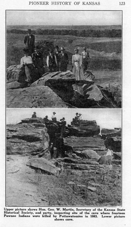 Upper picture shows Hon. Geo. W. Martin, Secretary of the Kansas State Historical Society, and party, inspecting site of the cave where fourteen Pawnee Indians were killed by Pottawatomies in 1863. Lower picture shows cave 124