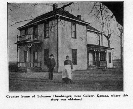 Country home of Solomon Humbarger, near Culver, Kansas, where this 230 of their past history. The meager account here given was obtained by a most diligent inquiry. It belongs to the history of these valleys of our state and should not be entirely lost. Many and interesting were the incidents which happened while camping with the Indians and sometimes they proved to be very disagreeable, as was the case when the following episode took place. Solomon Humbarger Is Accosted by a Sioux Brave With an ox team he was following along behind a band of friendly indians, a hunting party going westward. In his wagon box he had a barrel standing upright with his rifle standing in the barrel. The following is an excerpt from one of the conversations: One of the braves, a big, burly looking savage, Mr. Humbarger said, was lagging behind the band for the purpose of making me trouble. Seeing I was alone he accosted me in a rough manner, making hostile demonstrations and the team came to a stop. He could talk but few English words, and these were cuss words, for mean people always learn cuss words first. He was boisterous, no doubt intending to scare me. I did not know what he wanted but surmised trouble ahead. Me Zoo (meaning Sioux) God d--- you, repeating these words over again and again. I soon saw what he wanted, for, climbing up on my wagon, he made for the rifle. I was standing very near the team watching his movements closely. When he took hold of my rifle and was taking it out of the barrel I pulled my revolver and cocked it, while my left hand rested on the hips of the near ox. I leaned over, my right hand holding the revolver, aiming it close to the savages breast. In a tone not to be misunderstood I commanded him to put it back. I said, Put it back, I dont want to kill you, but put it back there. The savage was very obstinate, but he saw I meant business and finally set it down in the barrel, got out of my wagon and left me. Of course I would have killed him, as I could hardly have done anything else. It would not do to let an Indian bluff you. I would have gotten away all right, but of course I would have lost my team. The whole band was only a short John Cline, Brother-in-law of Humbarger John Cline was born in 1842, came to Kansas in 1858 and to Salina in 1860. He worked for General McGee surveying Lincoln County. Adam Calwell was chain carrier. He also worked for James R. Mead hunting and trapping. The principal work was poisoning wolves for their pelts. Mead and Haynes were partners in hunting along the Saline and Solomon Rivers and tributaries. Haynes mysteriously disappeared on one of these trips and was never heard of again. There was suspicious talk of foul play in about Salina, our headquarters, Cline said, but the matter was never fully investigated. Dick Alley Dick Alley, as he was known by the settlers, was christened Napolean Bonaparte. The name, Dick, for short, was only a nickname. This was told the writer by his sister, Mrs. Solomon Humbarger. He was a well built, athletic sort of man, quite a foot racer, an accomplishment which proved a very valuable attainment at one time of his life, as has been related. He lived in the Humbarger neighborhood in Saline County and moved to the northwestern part of Lincoln County in the latter part of the sixties, which was then the very outskirts of the settlements. |