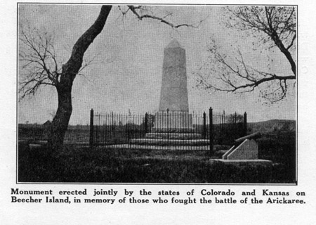 On my arrival, approaching from the south, the first sight in the distance which greeted my eyes was the monument. It was erected jointly by the states of Colorado and Kansas, at a cost of five thousand dollars. It is of light Barre, Vermont, and Colorado granite, and is eighteen feet high. Lieutenant Fred H. Beecher, U. S. Infantry, Surgeon J. H. Mooers and Scouts Louis Farley and William Wilson were killed in the battle and are buried on the Island. The following description taken from the monument tells the story: