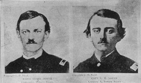the village. Made a grand charge and it was a complete victory. Took the whole village of about eighty-five lodges. Killed about sixty Indians. Took seventeen prisoners and about three hundred ponies and robes, etc., innumerable. Rained pretty hard tonight. When the Norths with their Pawnees had gone about fifteen miles north of the point where the command had been divided into three sections, a Pawnee arrived from General Carrs command with a message ordering the Norths to join Carr at once. The Norths raced away to Carr and learned that the Pawnees who were with Carr had located Tall Bulls camp. Carr was concealed in the sand hills about three miles northerly from the Cheyenne village. After resting for a few moments preparations were made for a charge on the hostiles. As Royall and Cody could not be located it was decided to attack without them. The Pawnees removed the saddles from their ponies to enable them to ride faster and when the order to charge was given Norths Pawnees were the first to reach the Cheyenne camp. When Captain Luther North went over the battlefield in company with Mr. R. H. Bruce, present owner of the site, Mr. Emil Kopac, historian, of Oshkosh, Nebraska, and the writer, on June 6, 1929, his recollections and descriptions of the victorious day of sixty years before were as clear as the morning dew. Racing down a long ravine from the north they came to a fifteen-year-old Cheyenne boy herding a band of horses about a half mile from the village. In place of riding away to save his life the boy successfully herded the horses to the village in order that his people might escape on the animals. Then turning to fight off the invaders, while the women and children fled across the little creek, he died with others of his comrades in defense of his people. Major North, who rode a very fast horse, was over a city block ahead of everyone else when the village was reached. Captain Luther North and the Pawnees came next. As the North brothers, Sam Wallace and Captain Cushing stopped at a big lodge located at the westerly end of the village, to drink from a water keg which they had discovered there, a wounded white woman crawled from the lodge, threw her arms about Cushings legs and frantically implored him as best she could to save her life. She could not speak English. The lodge was