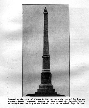 four feet deep. It was musical with the notes of many birds, which from the vast expanse of silent prairie around, seemed all to have collected here. We continued on our route along the river, which was populous with prairie dogs, the bottoms being entirely occupied with their villages. Such was Fremonts description of the Republican valley in 1842, but he does not say anything about meeting Indians, nor does he mention the village of the Pawnee Republics. None of the travelers who passed over this route, among whom were Horace Greeley, who made a stage coach trip through to Denver about the year of 1859, mentions the village of the Pawnee Republic, and had it not been for the journal of Lieutenant Pike, the existence of this village site would have sunk into oblivion. But finding the description of the route taken in Pikes journal, historical societies in several counties both in Kansas and southern Nebraska, became interested; search for the ancient village site was made during several years, until it was finally located by Mrs. Elizabeth A. Johnson and her husband, George Johnson, as has been stated. The ocation is near the mouth of White Rock creek, two miles west of Republic City.* (See note.) Mr. and Mrs. Johnson generously gave this historical site, containing eleven acres of ground, to the state of Kansas. The Legislature of 1901 appropriated three thousand dollars to mark the site. Six acres of ground were enclosed with an iron fence and a Barre, Vermont, granite shaft twenty-six feet high was erected to mark the site of Pikes Pawnee village. For a full account, see page 15, Vol. 10, Kansas Historical Collections. At the time this village site was located near Republic, Kansas, certain historians contended that it was not the site of the village visited by Pike in 1806, as Pikes orginal map shows that the Republican river ran in an easterly direction at the point where the village stood, which was about forty miles west of where the river changed its course from an easterly direction to a southerly direction. As no village site was known to exist to the point designated on Pikes map it was presumed that his map was incorrect. Subsequently a village site was discovered near Red Cloud, Nebraska, which the Nebraska State Historical Society claim is the location shown on Pikes map. The Kansas State Historical Society contend that Pikes map is incorrect and that the monument dedicated near Republic, Kansas, on September 29, 1906, is correctly placed.