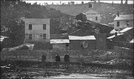 ![]() The ambrotype from wich this picture was reproduced is one of two in the Root collection showing Placerville scenes. Both were probably made the same year. John H. Clark helped rebuild the town in 1856 after a destructive fire (see p 228.) A sluice is in the foregorund. |