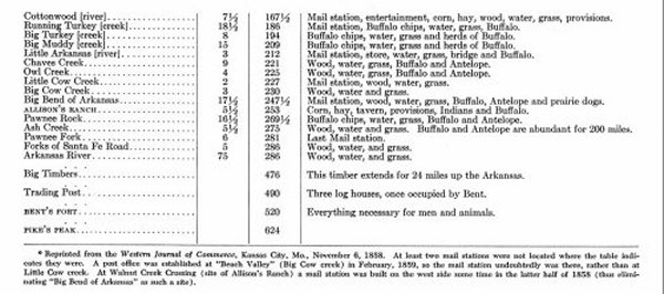 ![]() Allison's Ranch at Walnut Creek Crossing is pointed out (by arrow) on this map reprinted from the November 6, 1858, Western Journal of Commerce, Kansas City, Mo. The flags represent Hall & Porter's U. S. mail station sites selected by surveyor L. J. Berry in March, 1858. Station No. 14 (a log cabin) was erected at Walnut Creek Crossing within the year. But Station No. 15, at Pawnee Fork, because of opposition by Plains Indians, was not built till late in 1859, when Camp Alert (forerunner of Fort Larned) was established at that location. At Walnut Creek ranch the residents were occupied in killing wolves and collecting the pelts. Their winter's haul was sizeable. On April 7, 1860, the Kansas City Journal of Commerce reported: "Mr. Peacock, of Peacock's Ranch, better known by the old name of Allison's Ranch, arrived here yesterday with several wagons loaded with furs. Among the rest were 2,000 wolf skins. They were sold to Messrs. W. T. Wheatley & Co. This firm alone has bought over 5,000 wolf pelts this spring, besides a large amount of other furs. There are several other firms that have, probably, received as many. . . ." William Butze, the postmaster and mail agent at "Pawnee Fork" (see Footnote 50], also reached Kansas City on April 6. He had news of the Plains Indians: Butze says the Kiowas are divided on the question of joining the Comanches in a war with the Whites. Their old chief Tahausen says he never will raise the scalping knife on the white man again under any circumstances, and with this intention he has left Sautuck [Satank] at the head of the Kiowas, except about 60 lodges that followed him, and gone to join the Cheyennes who have sworn eternal peace with the whites. Again this year, as in 1859, the Santa Fe road was a busy thoroughfare. The Council Grove Kansas Press of April 30 stated that over 150 Pike's Peak-bound wagons had passed through on the 28th; trains of 10 to 40 wagons (mostly wool-laden) were "constantly arriving" from New Mexico; and the "outbound" freighting season was under way. Between April and mid-June, according to trader Seth Hays' records, 1,400 wagons carrying 3,562 tons of freight, passed through Council Grove for the west. These figures did not include the Pike's Peak emigrants' wagons, or the "incidental trade of the road." (Up to September 8, the season's total was recorded as 2,170 wagons, and 8,000 tons of freight.) [57] All this traffic also passed Walnut Creek ranch. Whether it afforded George Peacock profitable trade can only be speculated. On May 4 Bvt. Maj. Henry W. Wessells, with Companies G and H, Second infantry (and accompanied by his family) arrived at Camp Alert (Pawnee Fork) to establish a military post. His command had left Fort Riley on April 24. (In a letter of May 19, "Pawnee" wrote that Wessells' instructions were to "construct a Fort at this point and escort the Mails to and from Cow creek, east, and to and from the lower Cimarron, west, to this place.") The new post was named Fort Larned on May 29. [58] Two military expeditions were out hunting the Kiowas and Comanches in the summer of 1860. Maj. John Sedgwick headed the "northern column." He, and four First cavalry companies arrived at Camp Alert on May 23 (from Fort Riley) and were joined there by two Second dragoon companies. Sedgwick's command started June 1 on a 30-day pack-mule scout; forded the Arkansas three miles below Cimarron crossing on June 4; moved southward to the North Fork of the Canadian; scouted a while; marched westward into New Mexico; then moved northward, via the old "Aubrey" trail, to the Arkansas; camped on the north bank (near the Hamilton-Kearny county line of today) from June 29 to July 7; then proceeded upriver to Bent's Fort -- reached on July 8. [59] The "southern column" which went out in search of the hostile Plains tribes was headed by Cpt. Samuel D. Sturgis. With six First cavalry companies, aided by 100 "Tonkaways" and 40 southern Comanches (as guides and spies), he left Fort Cobb, I. T., on June 9, and moved northward. Sturgis' command crossed the Arkansas nine miles below old Fort Atkinson on July 1, and remained several days in that general vicinity. [60] Albert G. Boone, of Westport, Mo., en route to "Colorado" with his family, and others, wrote this letter from "Walnut Creek, (on Big Arkansas,) Peacock's Ranch, June 28th [1860]": Friend Mac. Here we are -- 15 days out -- almost without an effort; found the road good beyond all expectation. . . . Our friend Geo. Peacock, the present occupant of this post, is the prince of good fellows -- has everything a traveler wants, from an ear of corn to the greatest luxury. His store, as well as that of [Seth] Hays & Co., of Council Grove, and M. Conn's [also at Council Grove], are equal to any in Westport. . . . Around the end of June, Kiowa Indians showed up in the Great Bend of the Arkansas country. In a July 11 letter from "Pawnee Fork," I. Powell wrote: "Kiowa Indians are seen occasionally near the post by soldiers out cutting timber . . . and are constantly seen near Walnut Creek, in small parties." A mail party reported, in mid-July, that a band of Kiowas had been lurking in the Walnut creek-Cow creek area "for the last two or three weeks past." [62] On July 9, at and near Ash Creek Crossing, three Kiowas killed two white men. One was a "poor German" (Christian Krauss?) whose mutilated body was found on the trail just west of Thompson's ranch. The other was John Cunningham (recently a soldier?) who died inside the cabin after receiving mortal wounds while outside it. Orville (or William?) Thompson fended off the Indians (who tried to burn his place), and escaped after nightfall. [63] Major Wessells (at Pawnee Fork -- Fort Larned) just prior to, or at the time of these murders, sent an express to the First cavalry troops, requesting that the area between Walnut and Cow creeks be scouted for the Kiowas and Comanches. Captain Sturgis' command arrived at Pawnee Fork on July 10. The next d