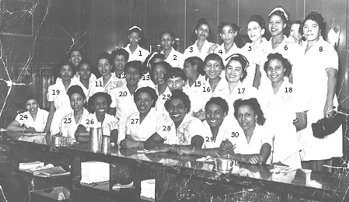 1. ___________ 2. Dollie 3. Gladys 4. Jenance 5. Stella 6. Flossie Cook 7. Mary Lue 8. Miss Amanda 9. Charlene 10. ___________ 11. Wonder 12. Helen 13. Etta 14. ___________ 15. Daisy 16. Suzie 17. Hallie (Rev. Preston's wife) 19. Glary 20. ___________ 21. ___________ 22. ___________ 23. ___________ 24. Willa 25. Christ 26. Lerrie (Rev. Hoskin's wife) 27. Lillie Pearl 28. Mae 29. ___________ 30. Wyvetta
